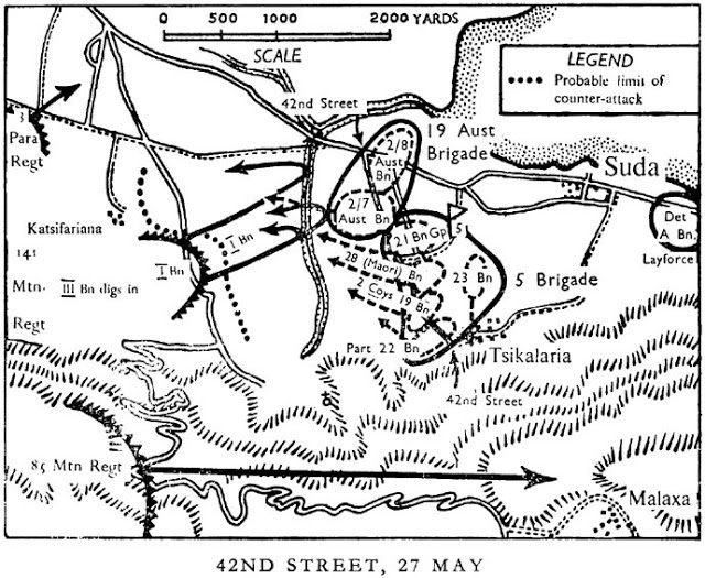 The Allies were in retreat and suffered many reverses in the preceding year. On the 27th May 1941, three New Zealand battalions and two Australian – the 2/7th and 2/8th – had been instructed to slow the German advance while the main Allied force evacuated. With most of the battalions at half strength or less, they formed up overnight along the line of a track known as 42nd Street. 42nd Street was a defensive berm that ran from Suda Bay to the Malaxa Escarpment, with dense olive groves to the west.