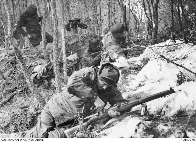 The battalion continued its advance to Chongju and Pakchon in late October. On 30 October 1950, tragedy struck, 3 RAR’s commanding officer, Lieutenant Colonel Charles Green, was mortally wounded by artillery fire, deeply affecting the men. The war changed dramatically in November 1950. As Chinese forces entered in massive numbers, Roland and 3 RAR were engaged in the bitter fighting around the Chongchon River before executing a hard fighting withdrawal south. Through December 1950, the battalion held defensive positions near Uijongbu and Chipyong-ni, facing freezing conditions and repeated enemy pressure.
