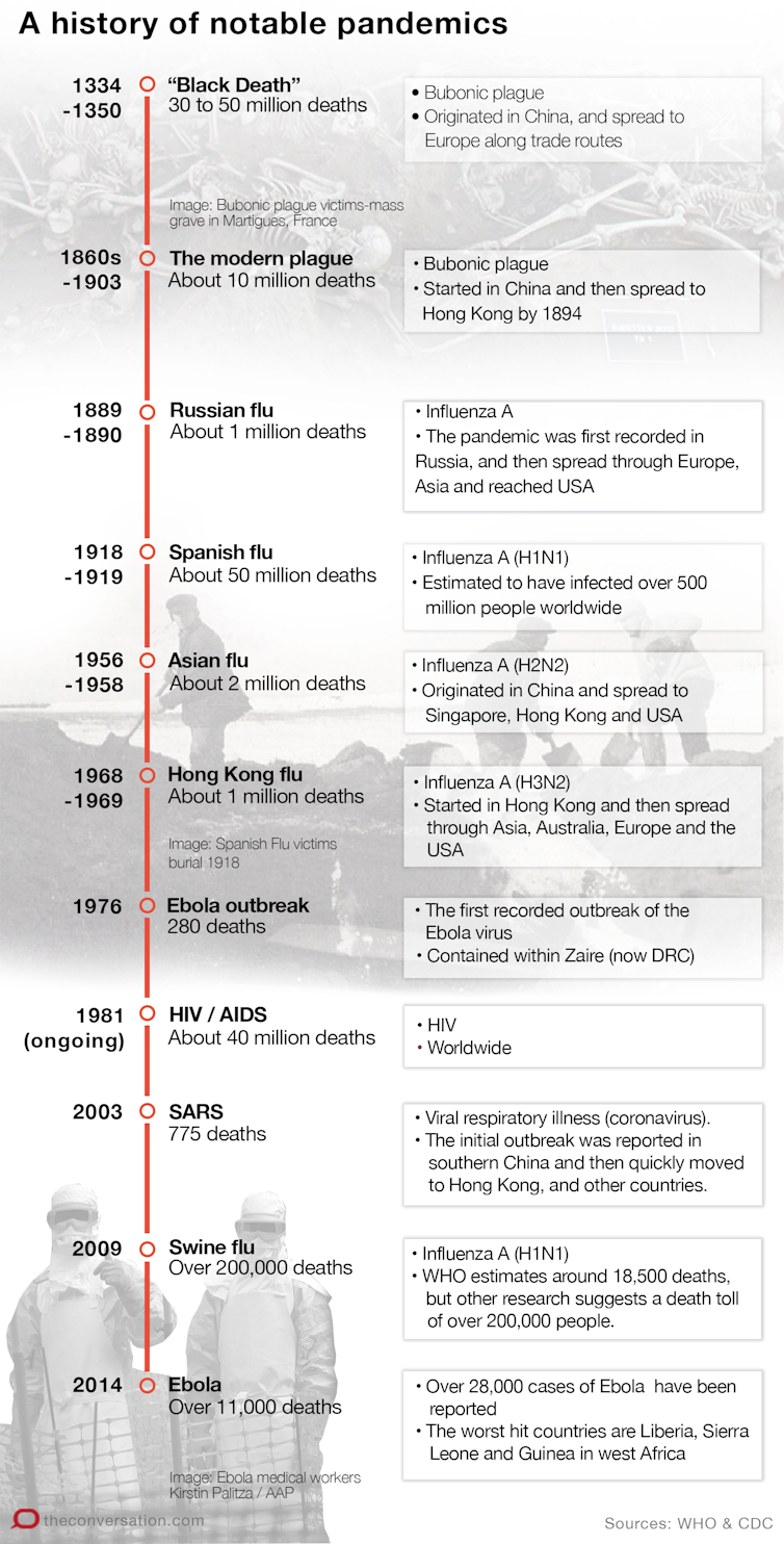 In the last century, this has happened several times, with numerous fatalities. The Spanish influenza pandemic of 1918 led to the deaths of more than 40 million people; more than double the number of fatalities in the First World War in the preceding four years. It progressively spread around the globe, with the modernisation of transport and trade systems, and mass-movement of military troops.