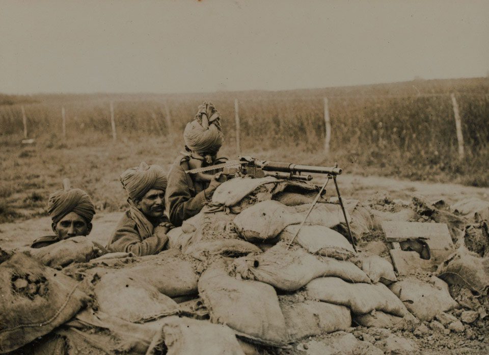 Belgium, 1915 – A Benet-Mercier machine gun section of 2nd Rajput Light Infantry in action in Flanders, during the winter of 1914-15. The Indian Army during World War I contributed forces to the European, Mediterranean, Middle East and African theatres. Over one million Indian troops served overseas, of whom 62,000 died.
