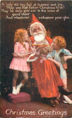 From the 1850s onwards, the English Father Christmas was depicted as a bearded old man wearing a long red robe trimmed with white fur and a pointed red hat, who brought gifts to good children. This image can be seen on English postcards from the early 20th century.