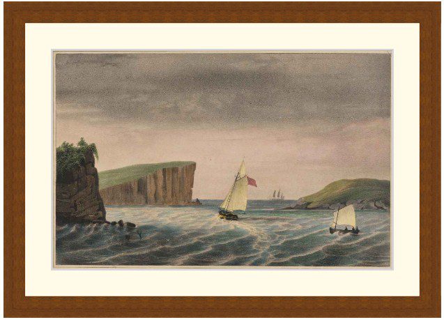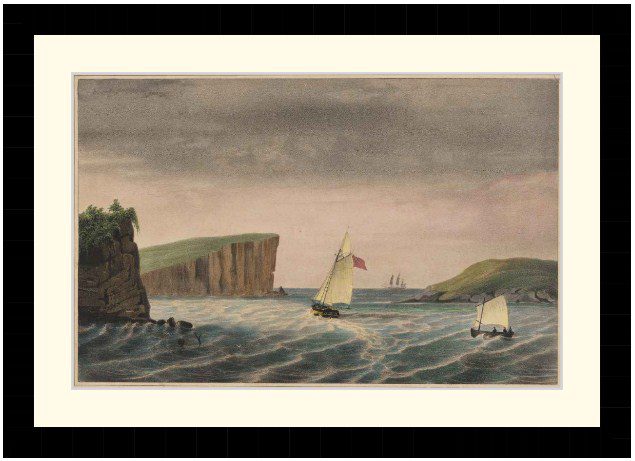 Shows three sailing ships working their way through the heads in a stiff breeze. Etching by De Sainson and A. S. Aulaire. ‘Vue des caps du Port Jackson’.