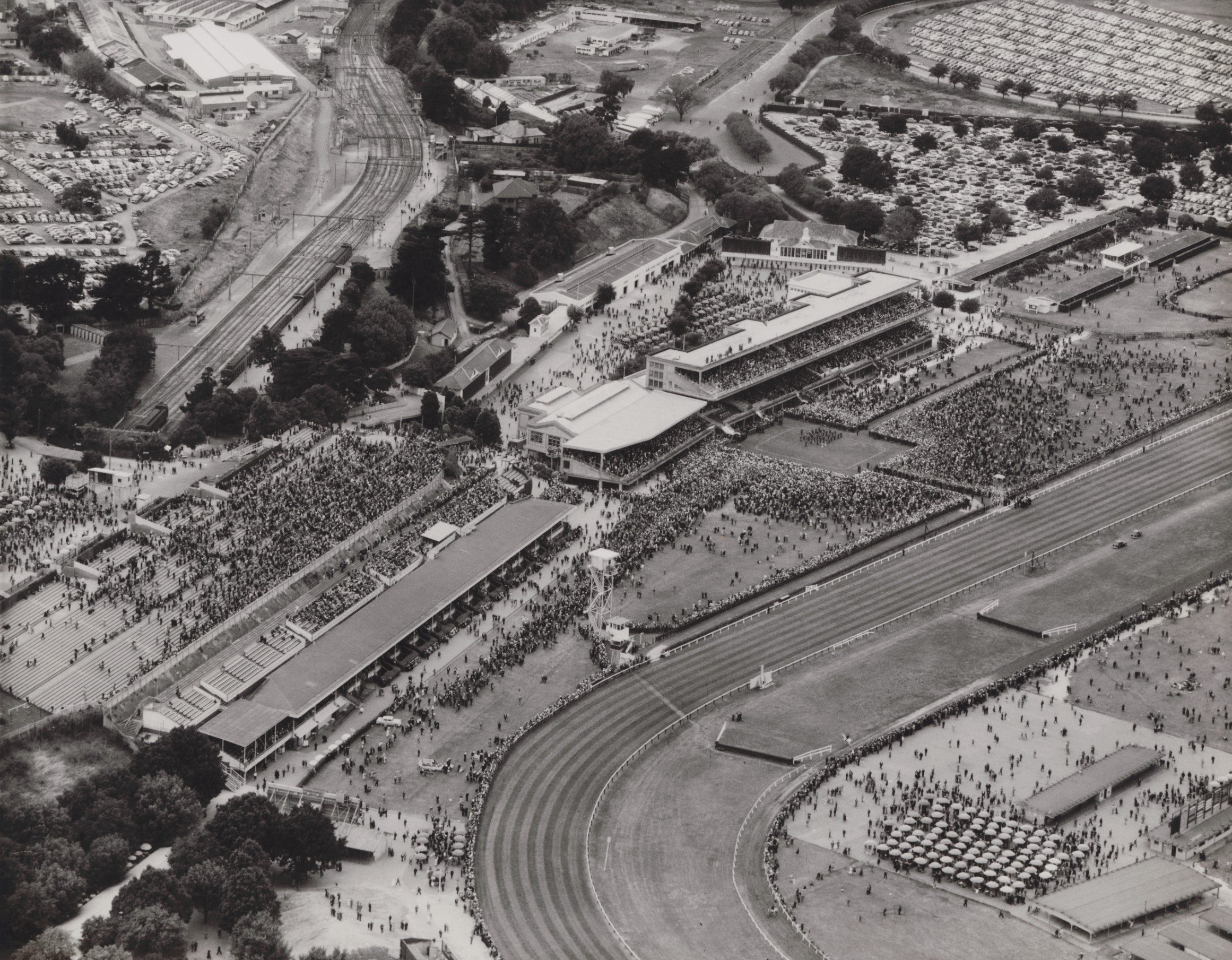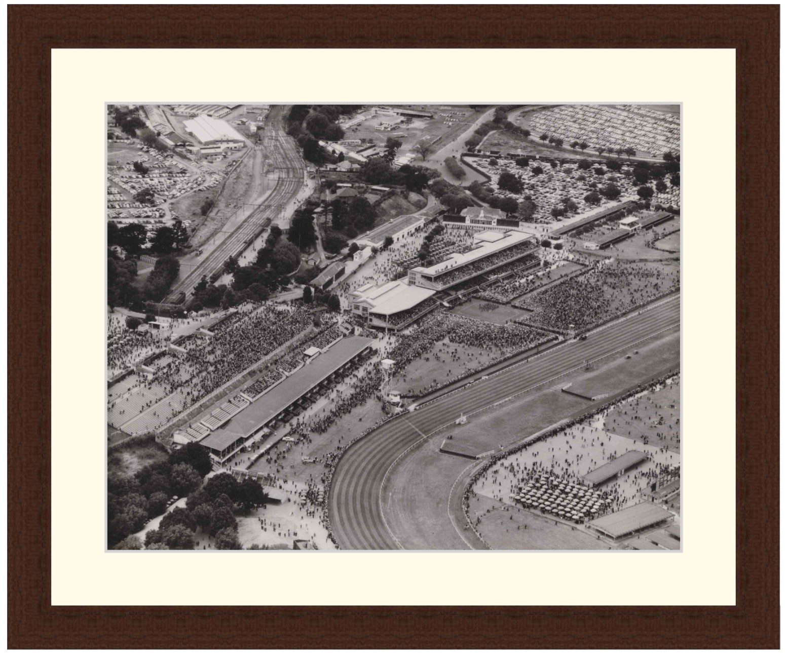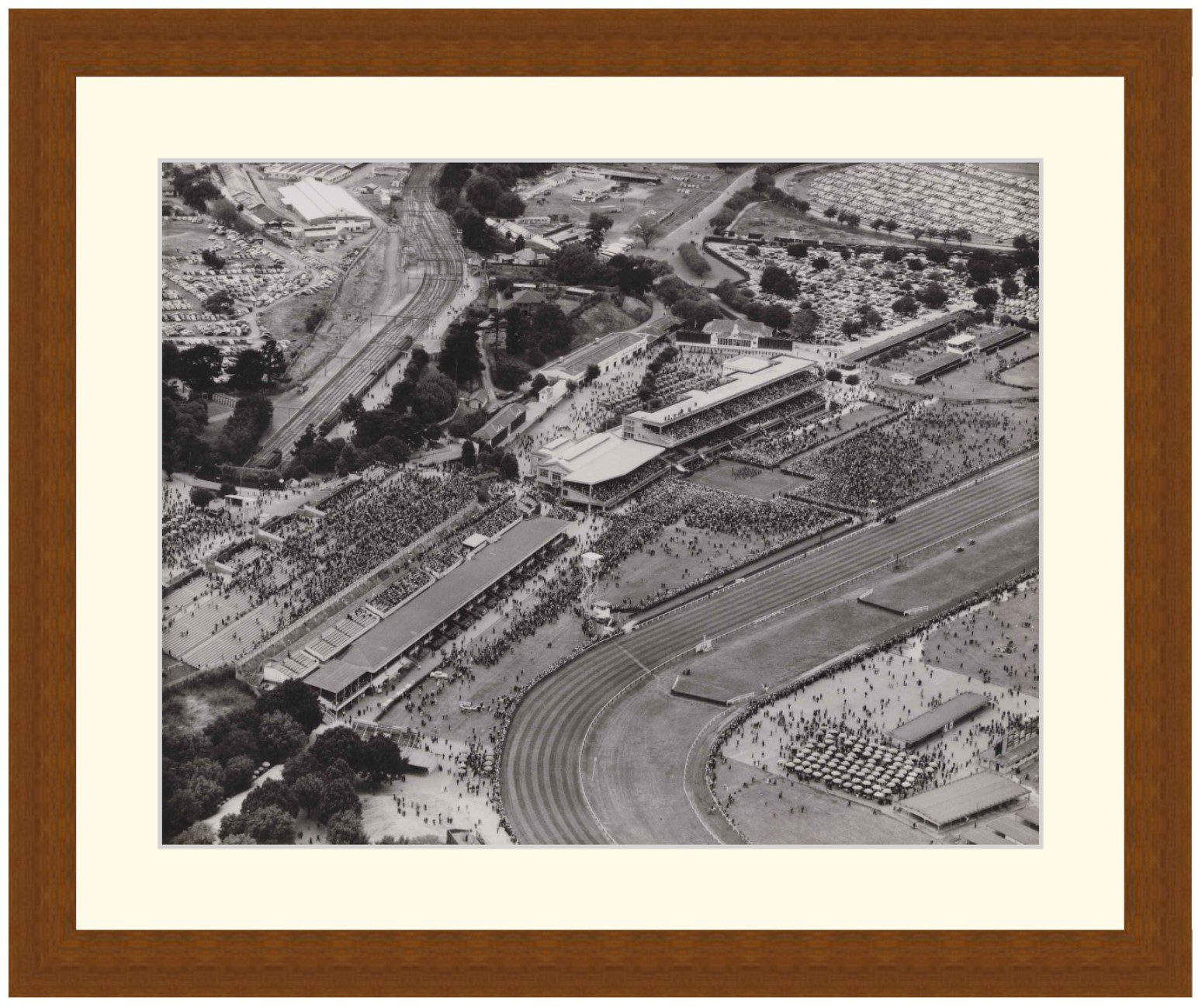 Framed Print of Aerial view of racetrack with large crowd on lawns and stands, filled carparks in right background.