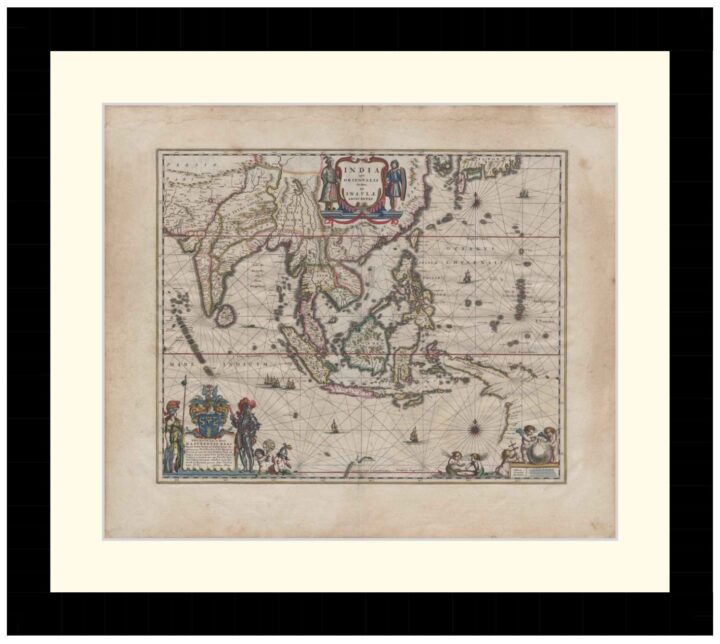 Map of Asia from c1650. Drawn by Willem Janszoon Blaeu shows islands, rivers, mountains, place names, ornamental scale, rhumb lines and compass roses.