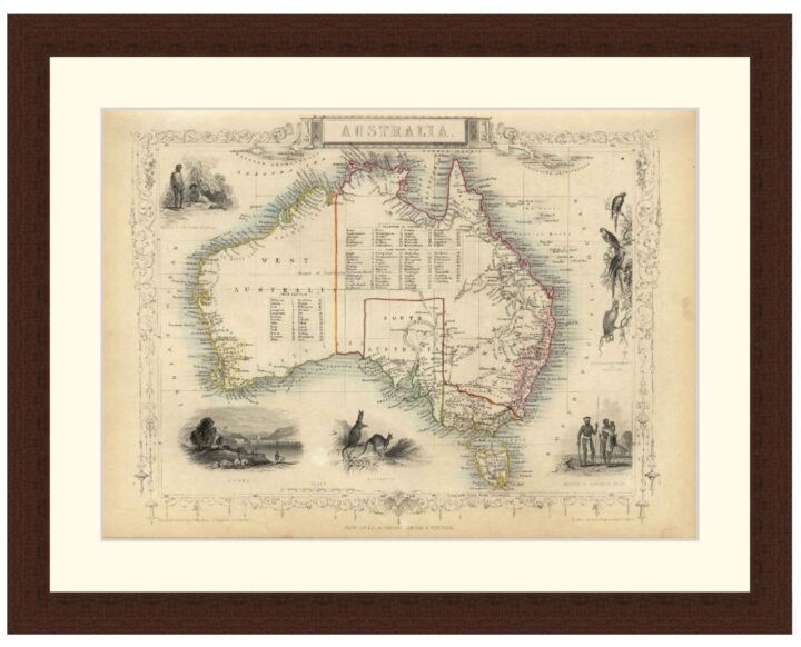 Map of Australia, published by J. & F. Tallis in 1851. The Illustrations by J. Marchant & Engraved by J.B. Allen. The Map Drawn & Engraved by J. Rapkin. Drawings depict birds, kangaroos, local people and Sydney harbor. Decorative border.