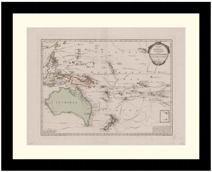 Tasmania shown joined to Australian mainland, Australia called ‘Ulimaroa’, Papua New Guinea shown as two islands. Place names in English and German.