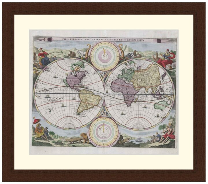 World in two hemispheres, with people and animals. Drawn by Nicolaes Visscher, 1663. ‘Orbis terrarum tabula recens emendata et in lucem edita per n visscher’. Includes two smaller spheres representing the planetary system as then imagined.