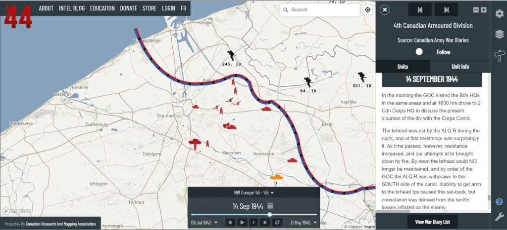 Project ’44 was launched in June of 2019 to commemorate the 1944 DDay landings in Normandy. In a first of its kind project, our team mapped out all the major fighting units of the First Canadian Army. Close to 100 different Canadian units were mapped along with their accompanying war diaries giving the public a unique perspective on the day-to-day operation of the war. Now the public was able to find out what happened on any given day of battle.