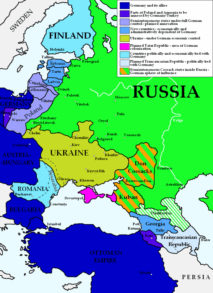 Similarly, even during the war, the Treaty of Brest-Litovsk between Germany and the new Soviet Russia suing for peace was extremely harsh towards Russia. Marking Russia’s exit from the war following its revolution, the treaty imposed significant territorial losses for Russia, losing large territories including Ukraine, Belarus, the Baltic states, and parts of Poland and Finland to Germany and its allies.