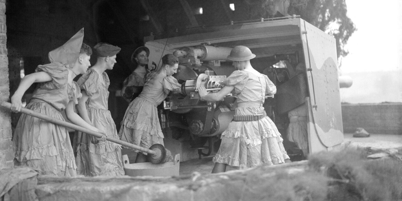 Even so, the administration had an uneasy relationship with these queer influences. When a dress rehearsal for a military drag show was interrupted by a Nazi attack, the performers rushed to their positions. These soldiers were photographed operating heavy artillery while still wearing their drag costumes. However, these images were suppressed by the Ministry of Information for fear that they may be discovered by the Axis powers—and this might make them appear weak to their enemies. Even after the war, these images remained secret: they were only made available to the public in 2018.