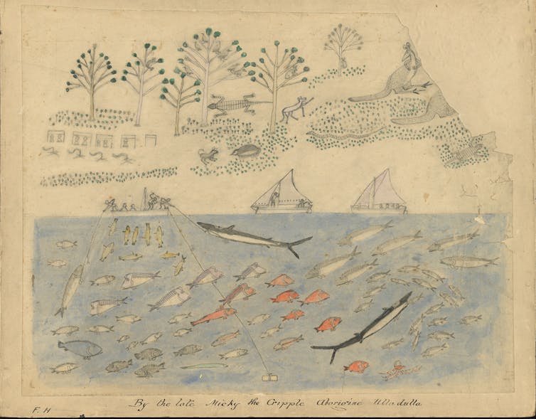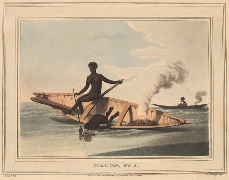 Other fishing methods have been recorded and described in oral histories, or they’ve been passed down and are practised still. These practices are a form of embodied or “living archives”, which is how we know about them today. Stories of women diving deep underwater for shellfish, walking out across the rocks at low tide pulling off abalone, or wading through billabongs to pick up turtles, are common in accounts from the time and these practices are still maintained by many Indigenous communities around Australia and the Torres Strait Islands.