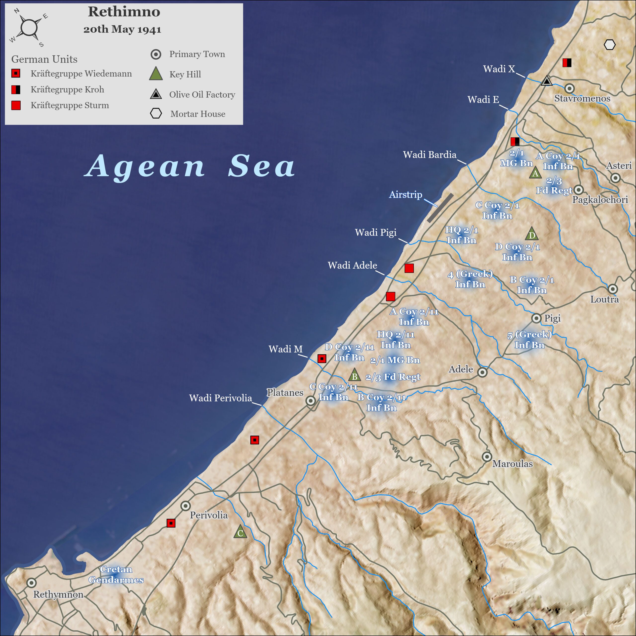 In May of 1941, as the German invasion of Crete threatened to swamp the island, a single Australian Army Brigade would find itself fighting for its life around Rethimno and its landing strip. Approaching Rethimno was the best of the best of the German army: 1,700 paratroopers of the I and III Battalions, 2nd Parachute Regiment, 7th Air Division, XI Air Corps.