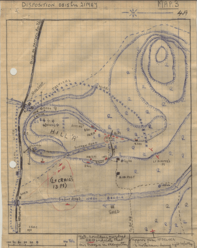 German mortars firing from Hill A had been falling on Lt-Col Campbell’s HQ area all night and had caused several casualties. He was determined to push them off the hill.