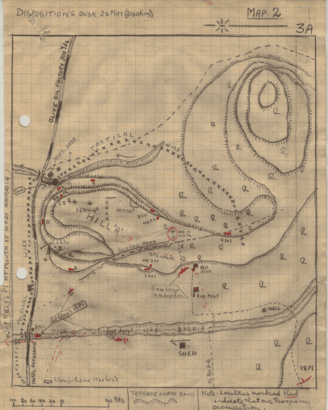 Campbell threw everything he had left from the 2/1st Battalion at the hill. The telephone lines had been broken so Campbell sent runners to assemble his last reserves in a ravine to the north of Hill, called Wadi Bardia. He then made his way alone to the wadi, dodging from cover to cover and avoiding occasional bursts of machine gun fire and sniper shots from the top of the hill.